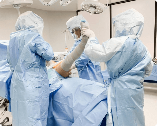 The preferred wound closure system is the Dermabond Prineo skin closure tape. With this system you will have sutures underneath the skin which will absorb with time. On top of these sutures, a clear piece of tape is placed. This tape creates a barrier between the incision and outside bacteria. Use of this tape allows you to begin showering normally within 24 hours of your procedure. You are not able to soak the area in a body of water. Additionally, you have no wound care with this system. You may remove the outer dressings 24 hours after surgery but should not have to perform dressing changes or clean the incision with special solutions. The tape will stay in place for about 14 days.